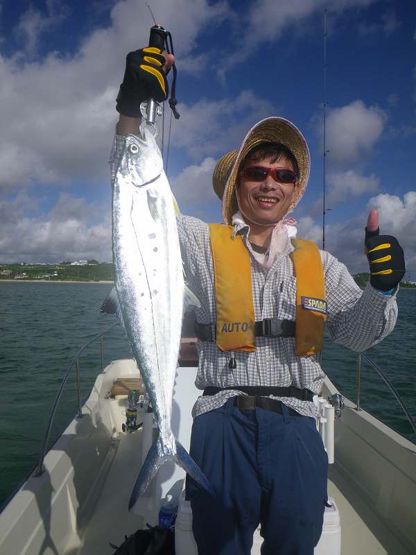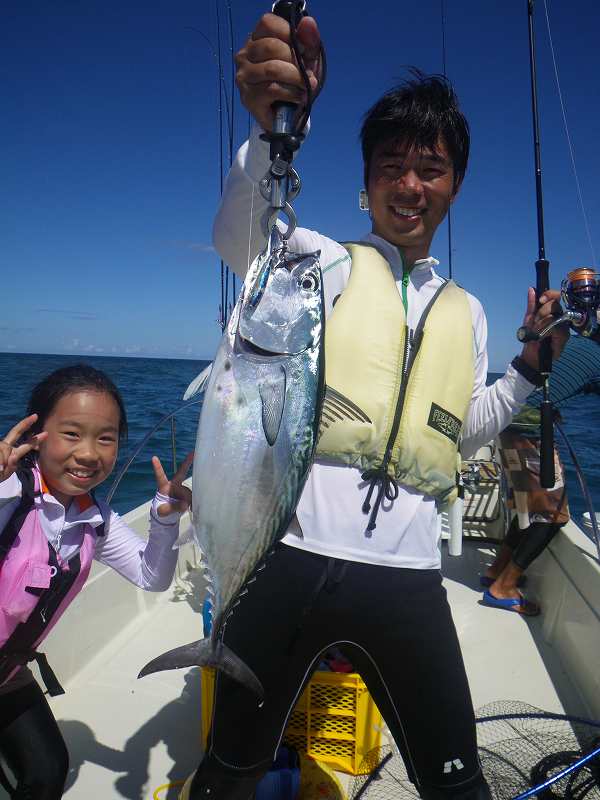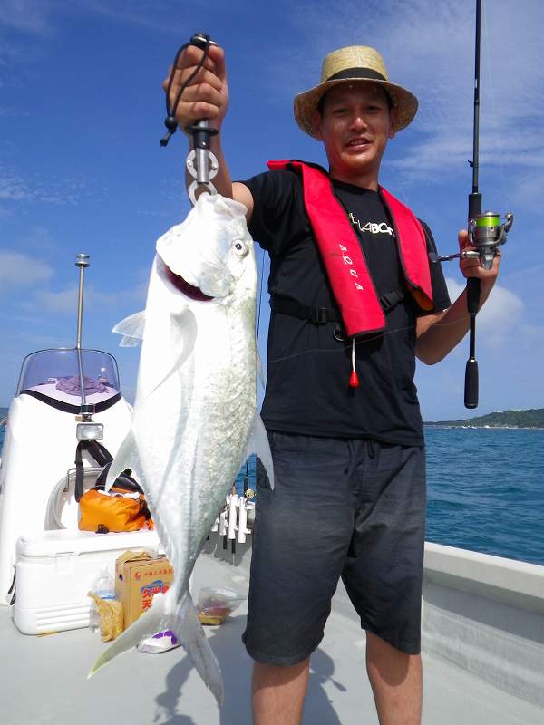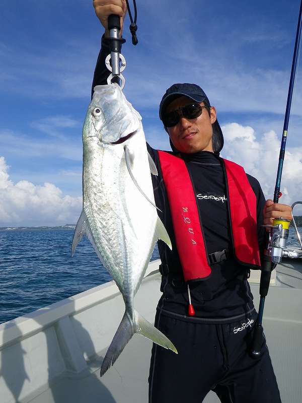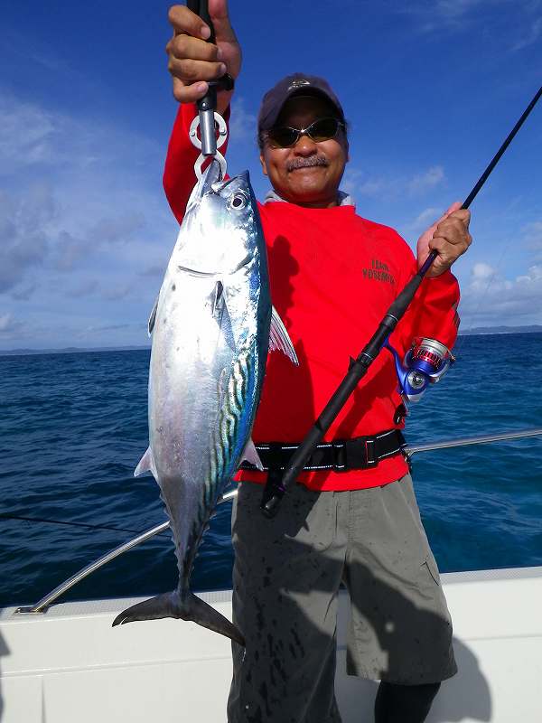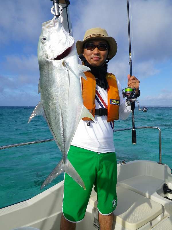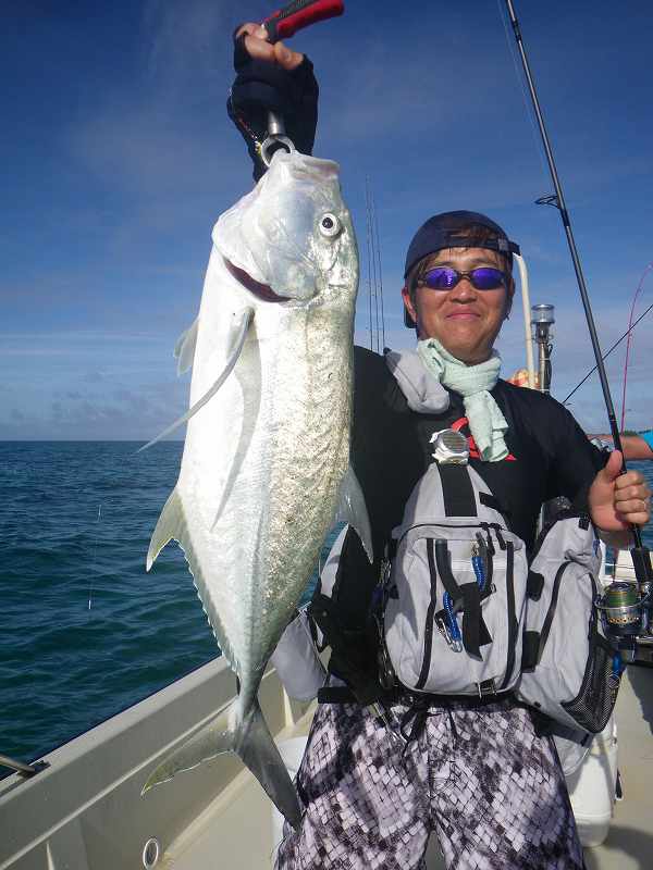 対象魚は主にガーラ(オニヒラアジ)の2~3キロやスマガツオ、ツムブリ、イケガツオ、ニジョウサバ、ダツなどですがベイトがリーフ内のシャローエリア(浅場)に入ると、リーフの魚達もベイトを捕食する為タマン(ハマフエフキ)、ミーバイ類(ハタ系の根魚)、ヤマトビ(ニセイッテンフエダイ)なども釣れてきます。